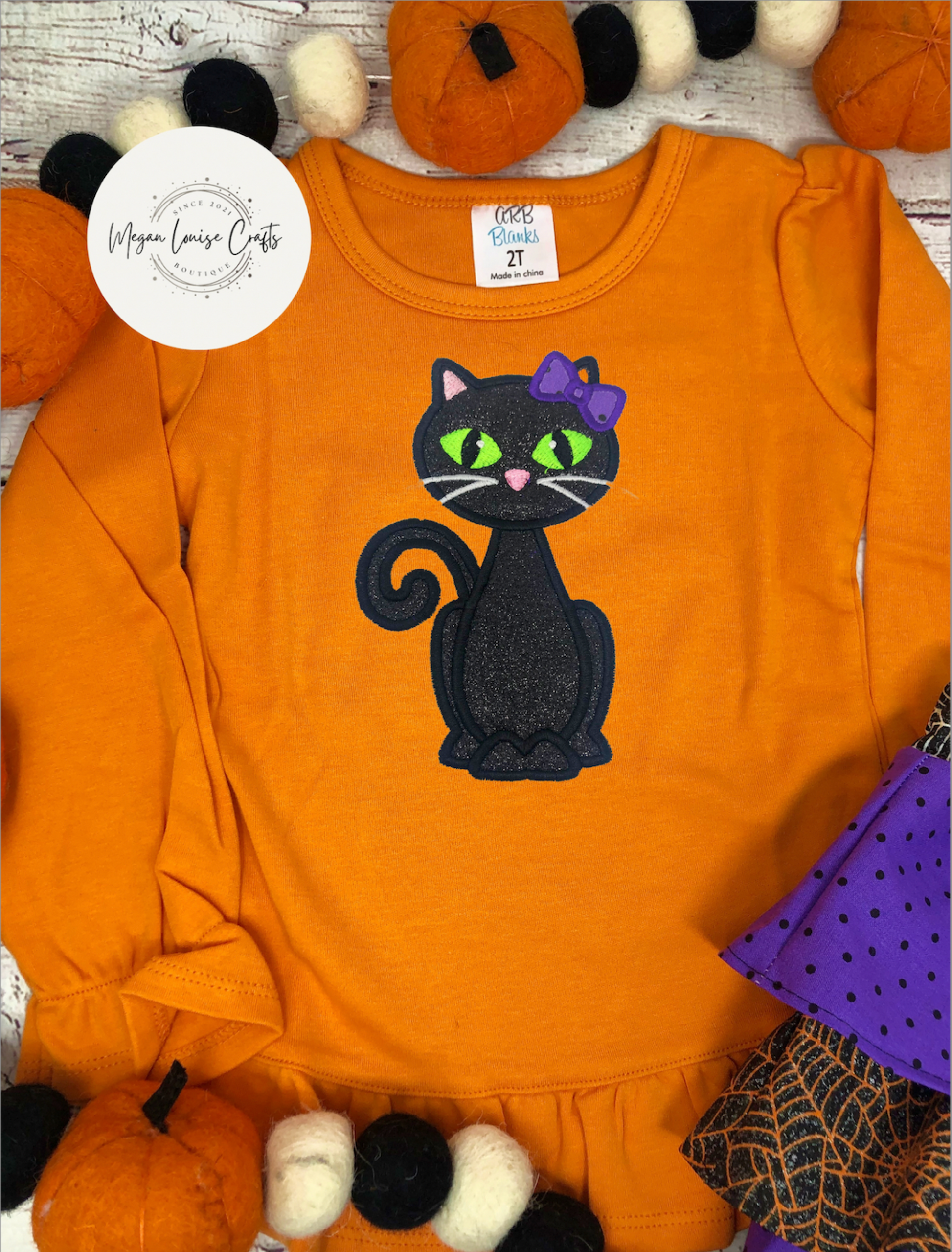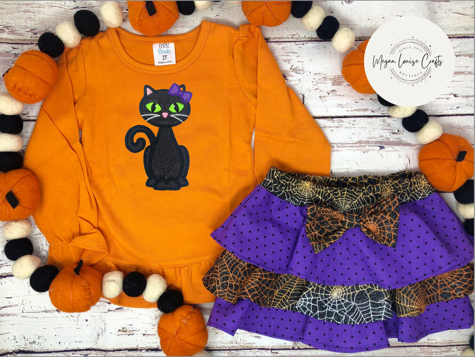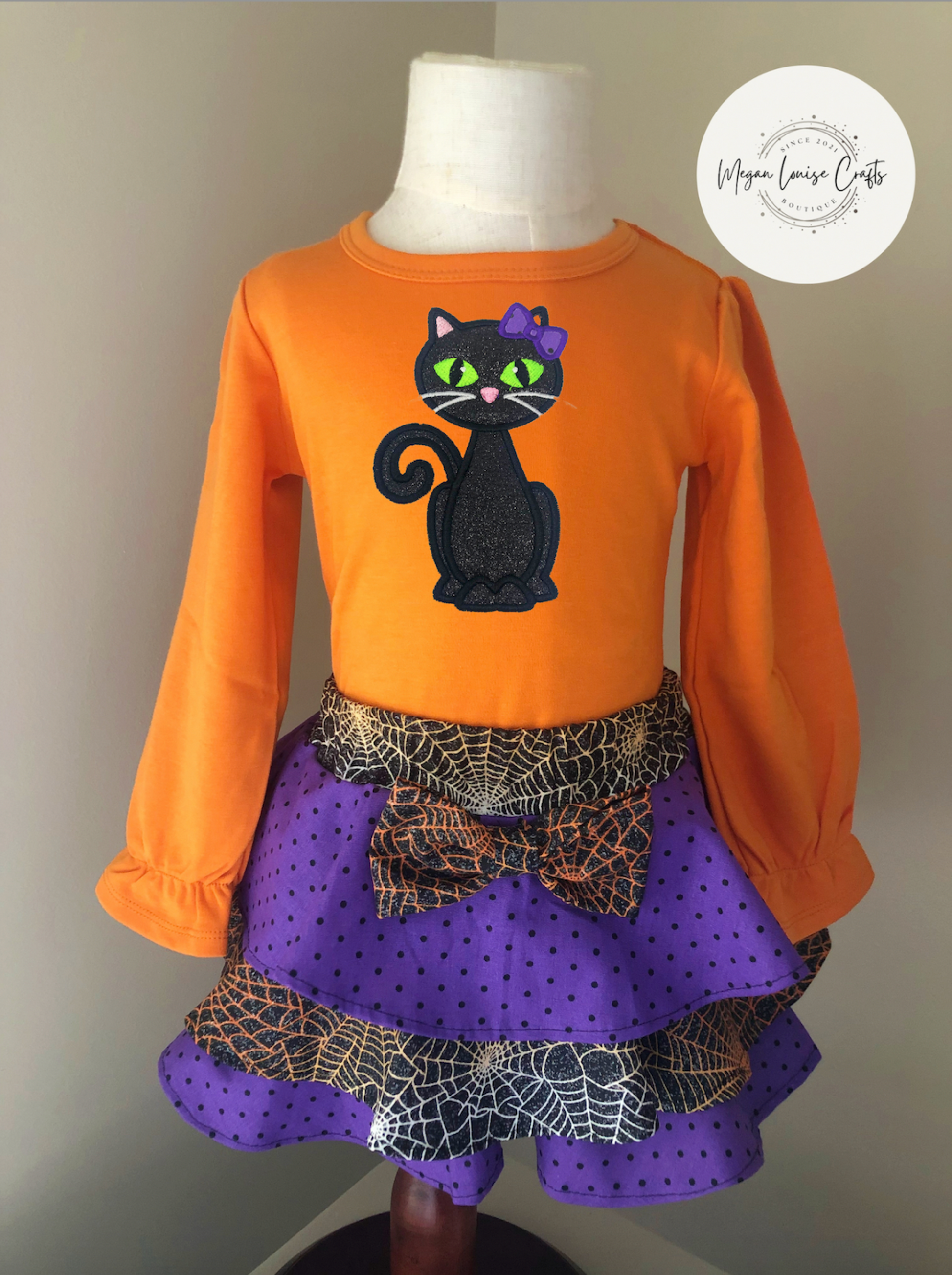 Get your little one ready for Halloween with this trick or treating outfit! This outfit is a perfect party outfit and is practical for your little one to wear. This is a spooky themed outfit and both the top and the bottom are made of 100% cotton. The shirt is embroidered and the appliqué fabric matches the skirt. The shirt is long sleeved and has ruffles on the sleeves and on the bottom of the shirt. The skirt is actually a skort, meaning that it has shorts built into them! The skort has 3 layers of ruffles and there is a bow on the front, which you can easily take on and off with the plastic snaps attached to the front.