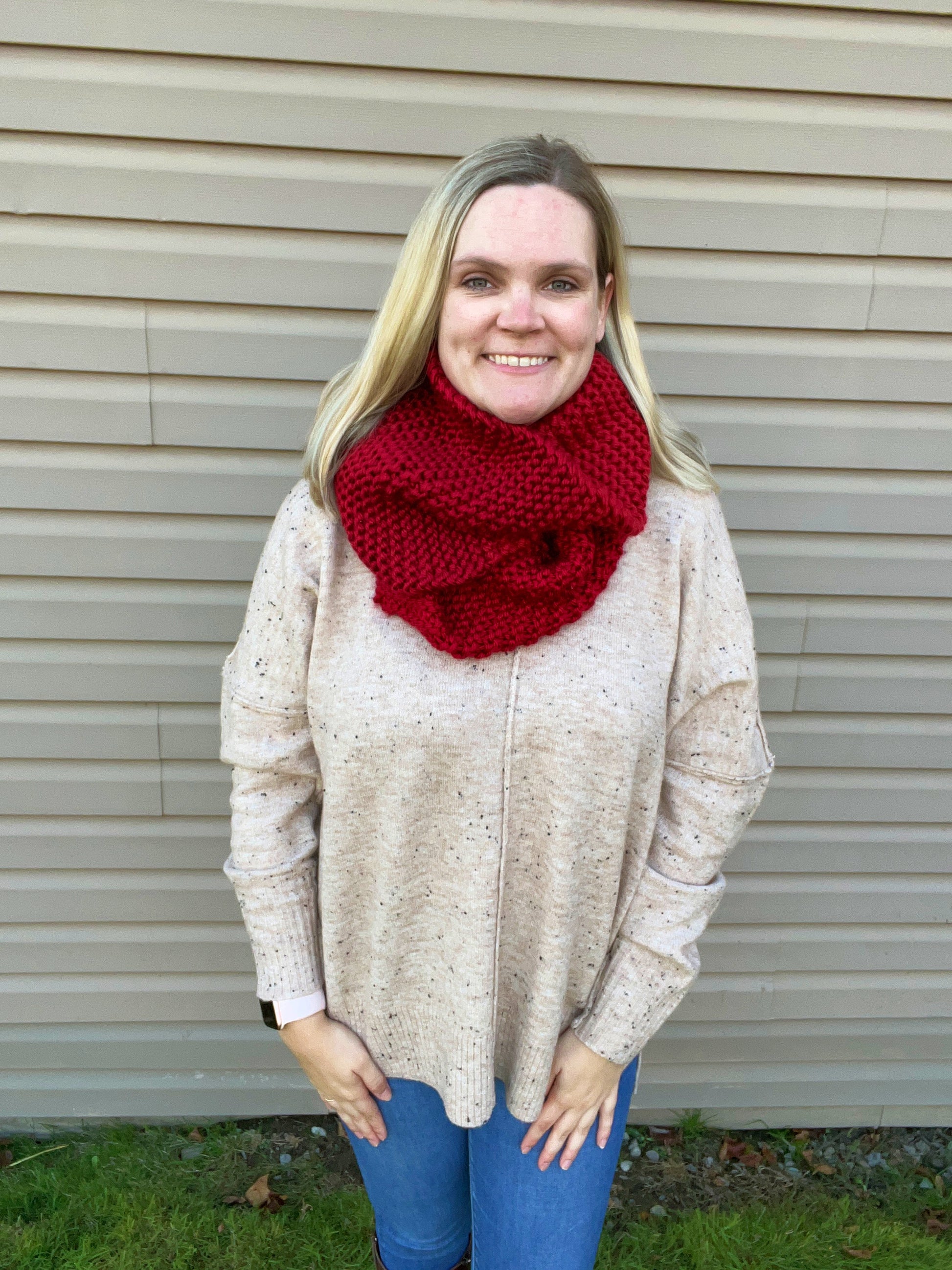 Wrap this scarf around your neck on a cold day and it will keep you nice and warm! This is a chunky knit scarf in red. You can comfortable wrap it around your neck twice and it would even be a great gift!