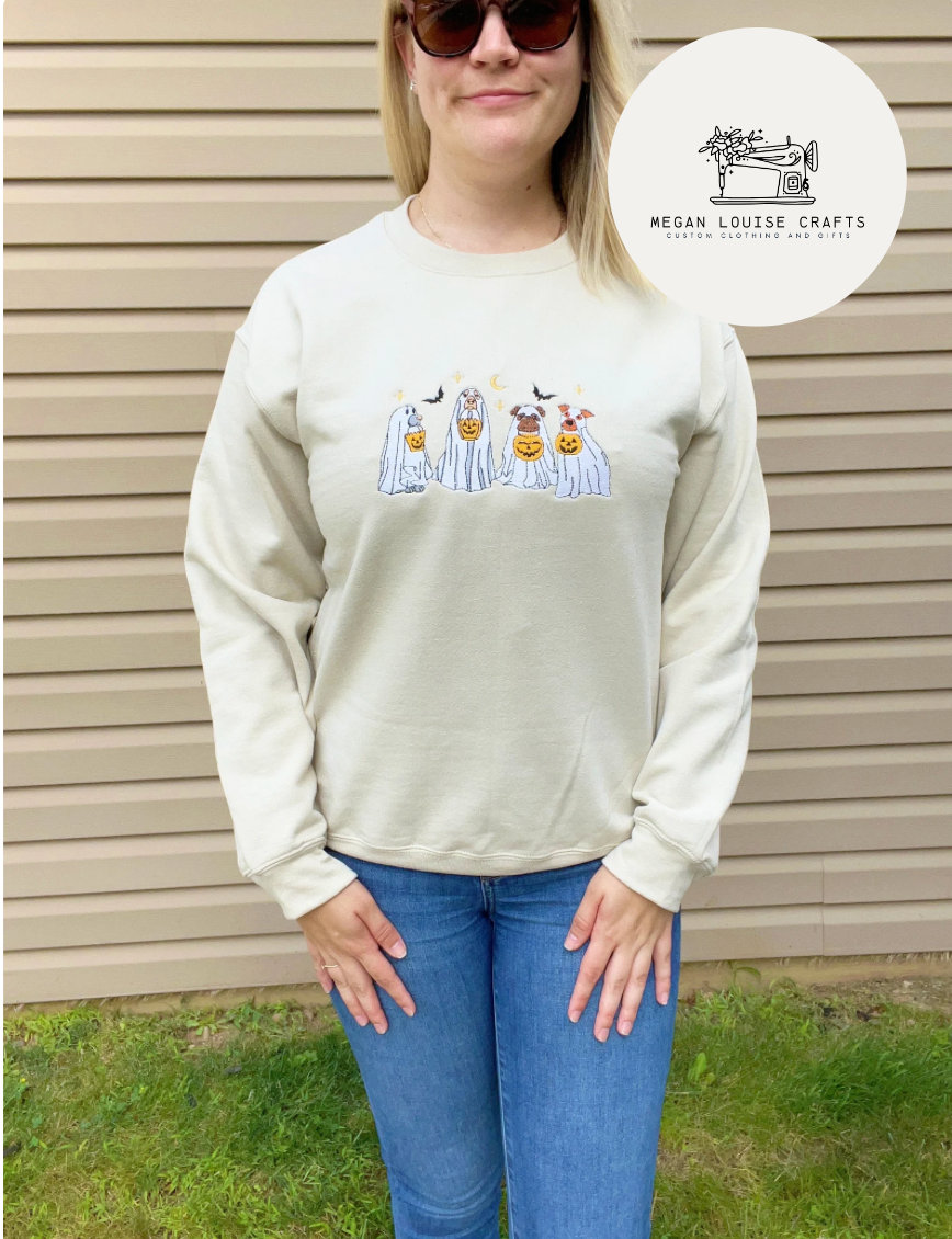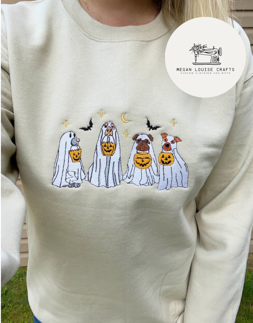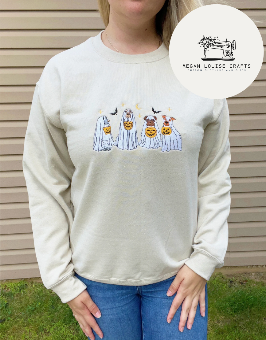 This embroidered sweatshirt is perfect to wear for spooky season! Made on a heavy duty cotton sweatshirt, this design is not only great to wear for the fall but it is made to last! Made on a sand colored Gildan sweatshirt and is machine washable.