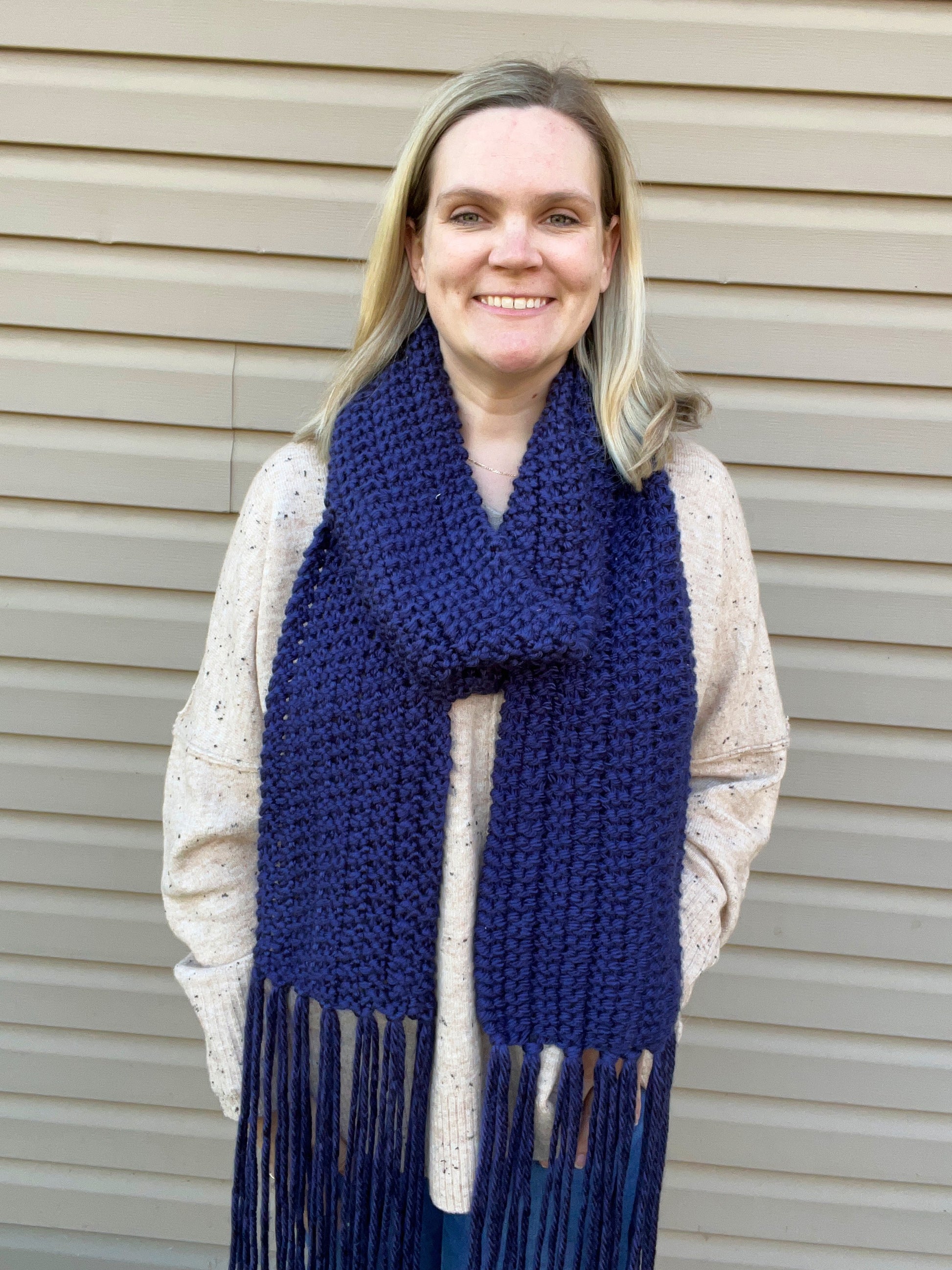 Wrap this scarf around your neck on a cold day and it will keep you nice and warm! This is a chunky knit scarf in dark blue. This scarf is over 60 inches long (with fringe) and it would even be a great gift! Made of soft, high quality super bulky yarn that you can wear year after year and it will still look the same as you when you got it.