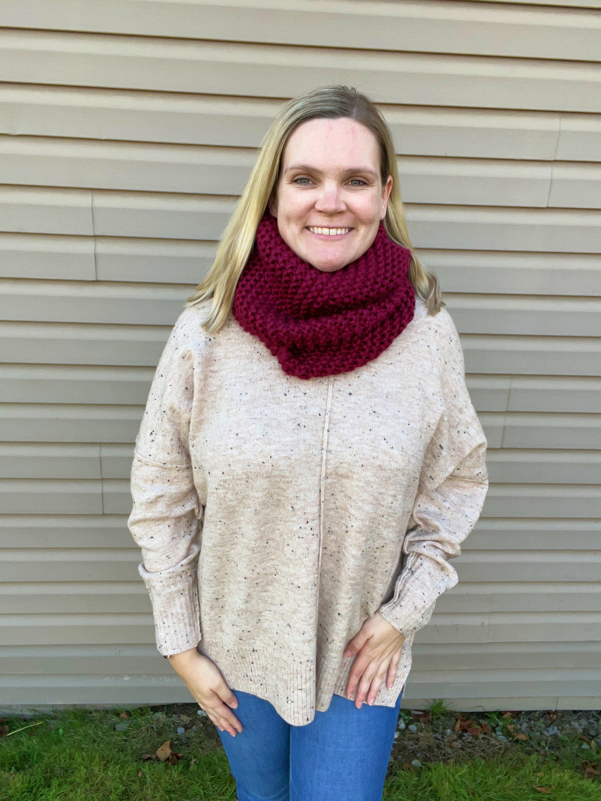 Wrap this scarf around your neck on a cold day and it will keep you nice and warm! This is a chunky knit scarf in burgundy. You can comfortable wrap it around your neck twice and it would even be a great gift!
