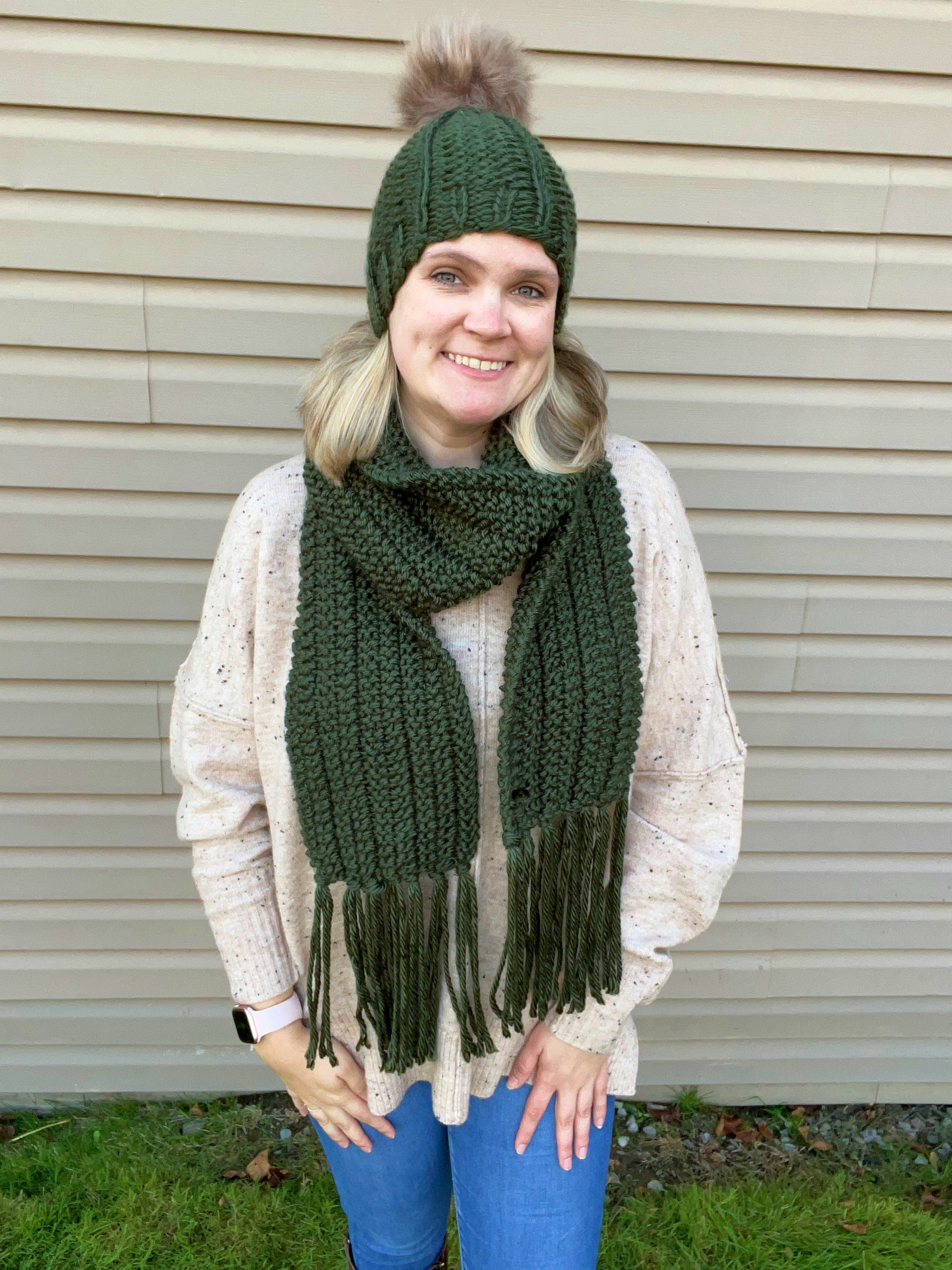 This is a matching dark green scarf and hat set. Made of chunky knit yarn these accessories are guaranteed to keep you nice and warm in the coming winter months! You can choose if you just want the hat, a scarf, or both the hat and scarf.