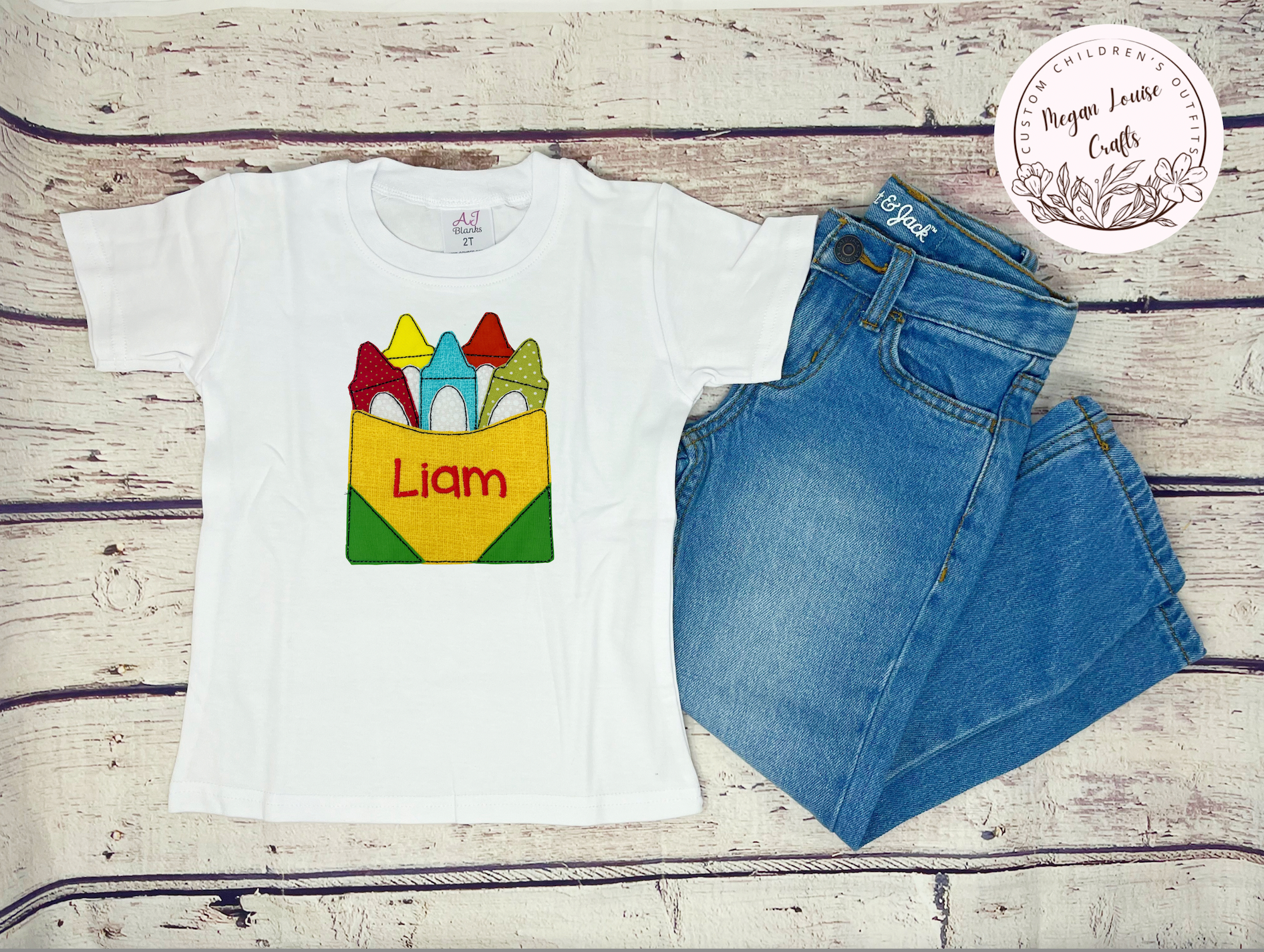 This is a custom embroidered shirt that is perfect for the first day of school! It is customized with your child's name and their grade level. You can choose to get it either in gray or white.