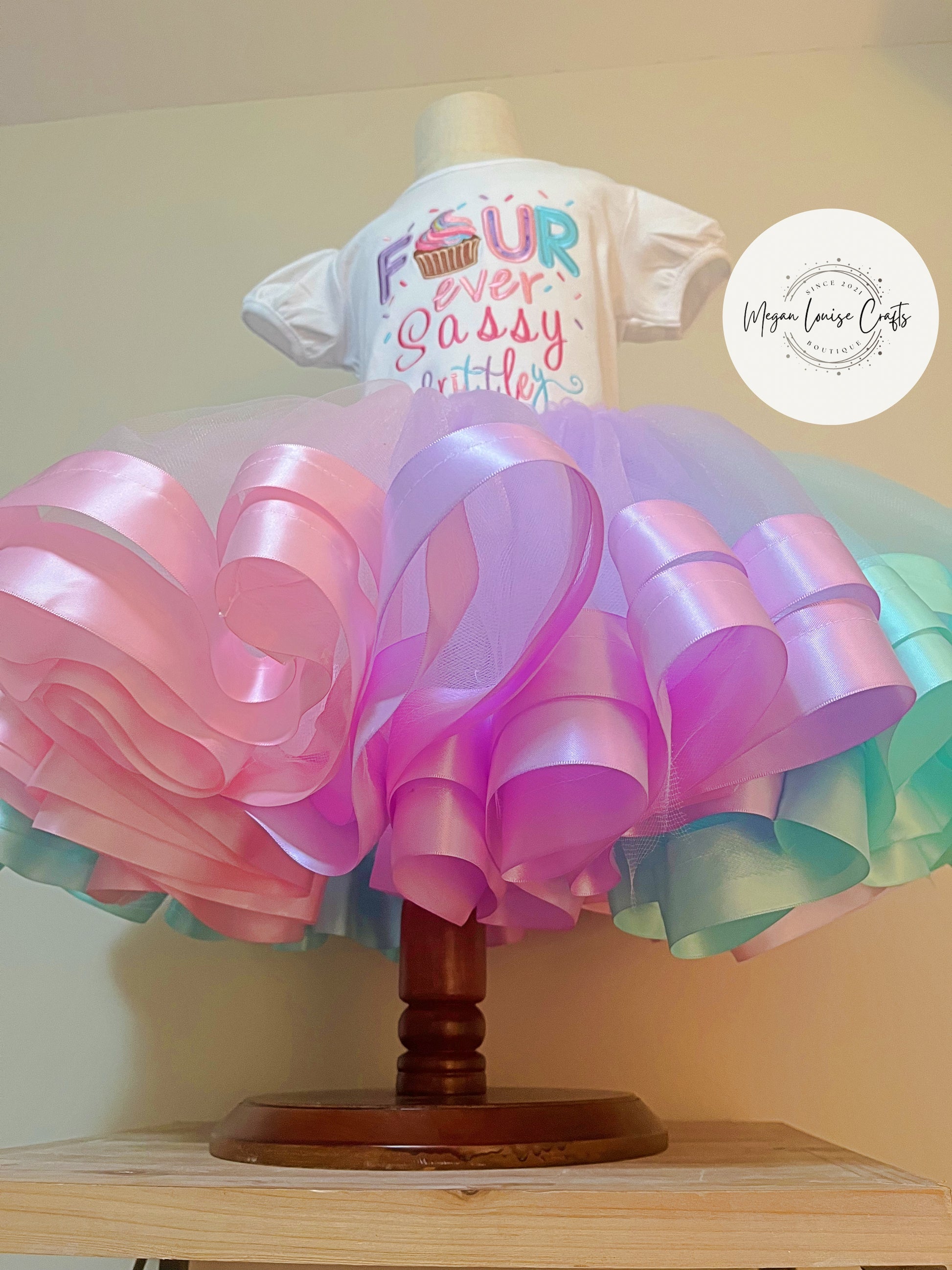 This four ever sassy birthday outfit is perfect for those who are sweet and sassy! The shirt is embroidered and can be customized with your child's name. It is made of cotton fabric and is boutique quality. The tutu has two layers of ribbon at the bottom, making it perfect and fluffy for the big day!