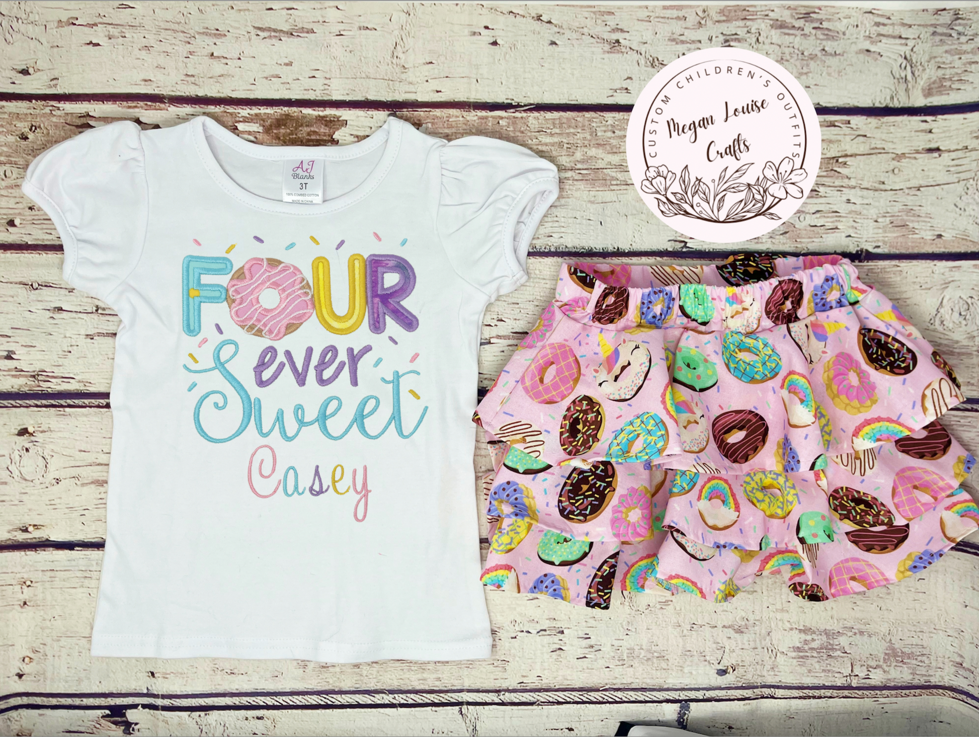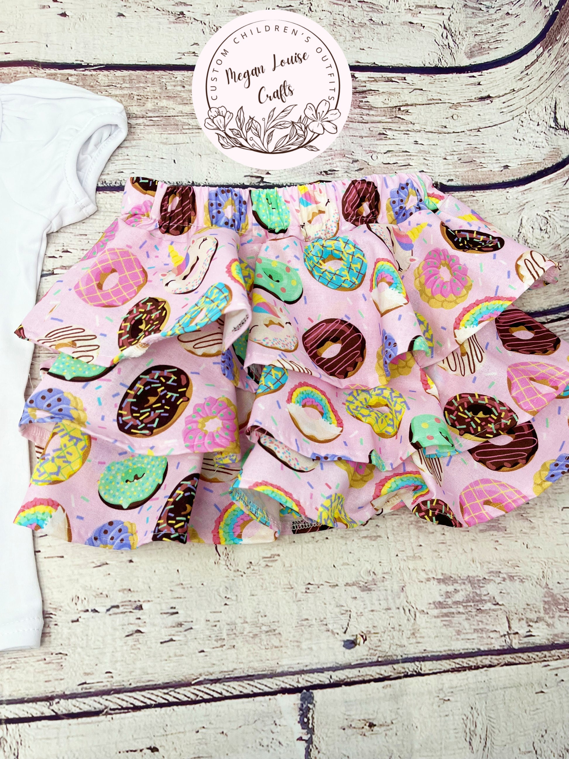 This is a matching birthday outfit that is perfect to celebrate your little one's big day! The shirt had puffed sleeves and is embroidered. The skirt has 3 ruffles and even has shorts in it, making it a "skort"! This outfit is practical and high quality and will ensure that your little one gets a lot of compliments.