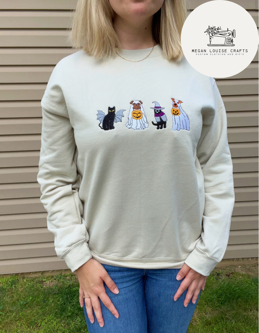 This embroidered sweatshirt is perfect to wear for spooky season! Made on a heavy duty cotton sweatshirt, this design is not only great to wear for the fall but it is made to last! Made on a sand colored Gildan sweatshirt and is machine washable.