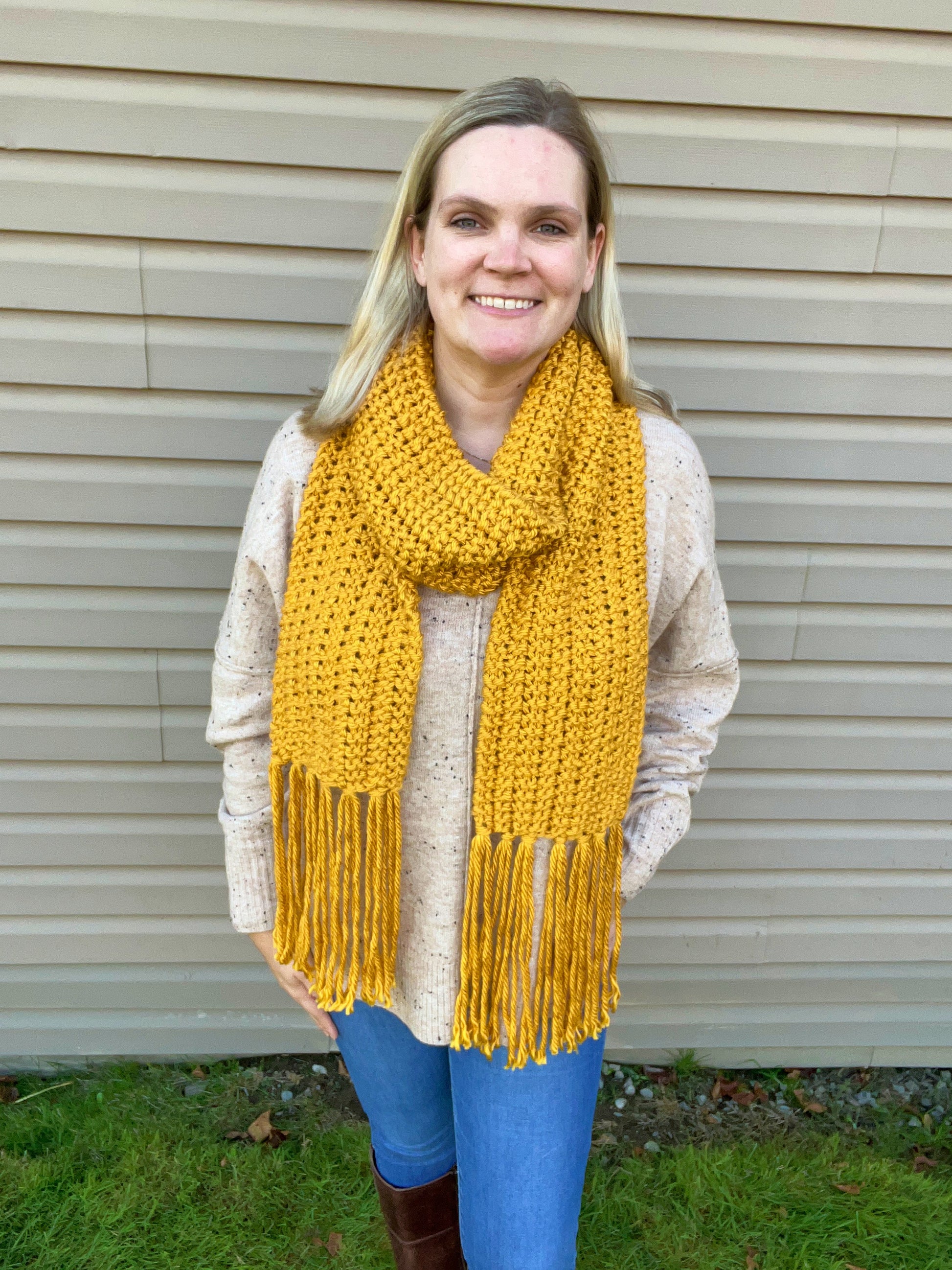 Wrap this scarf around your neck on a cold day and it will keep you nice and warm! This is a chunky knit scarf in mustard yellow. This scarf is over 60 inches long (with fringe) and it would even be a great gift! Made of soft, high quality super bulky yarn that you can wear year after year and it will still look the same as you when you got it.