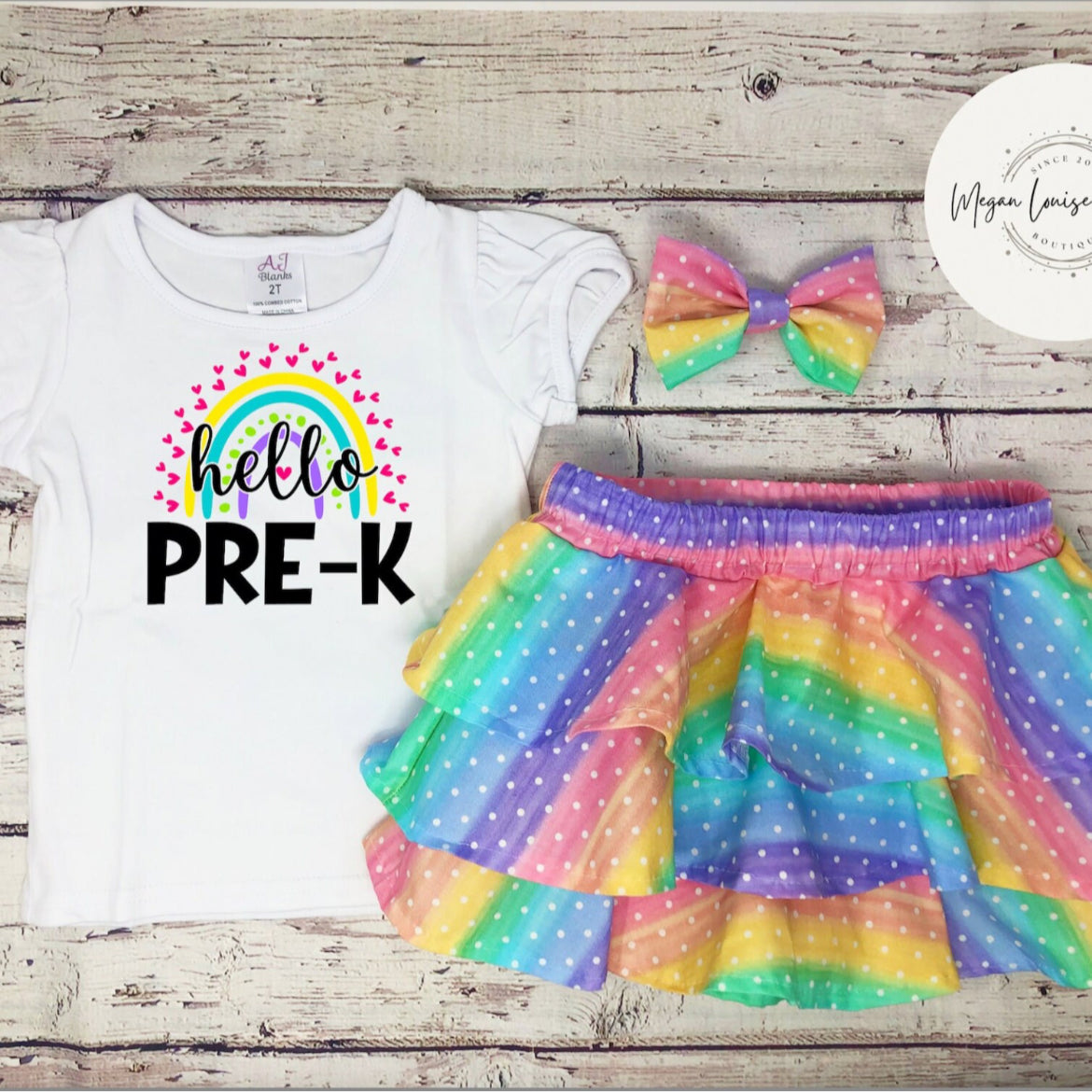 Back to school season is here meaning it's time to get your outfits ready! This is a matching outfit with a shirt and skirt. The shirt is made of high quality combed cotton and has puffed sleeves. You can choose if you want it to say pre-k all the way to 5th grade. You can decide between shorts, a skirt, and the ruffled skort. Please see image 3 for more details.