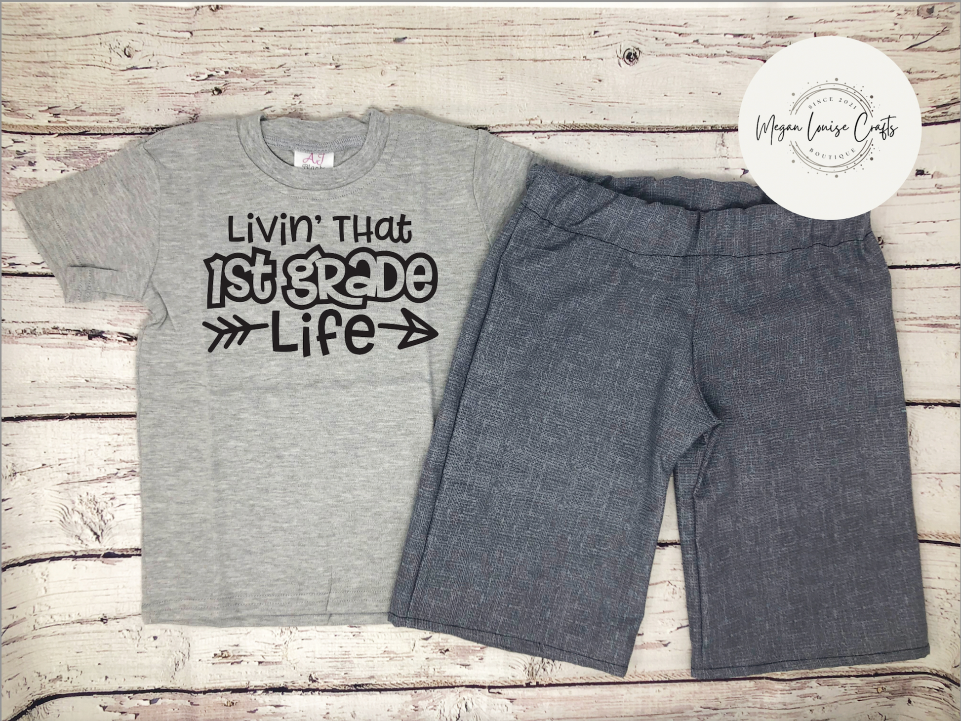 Now that it's back to school it is time to look cool! This outfit is perfect for your little one's first day of school. The shirt is made of vinyl and you can choose from pre- all the way to 6th grade. The shorts compliment the shirt and have an elastic waistband.