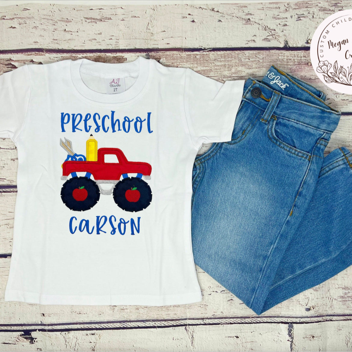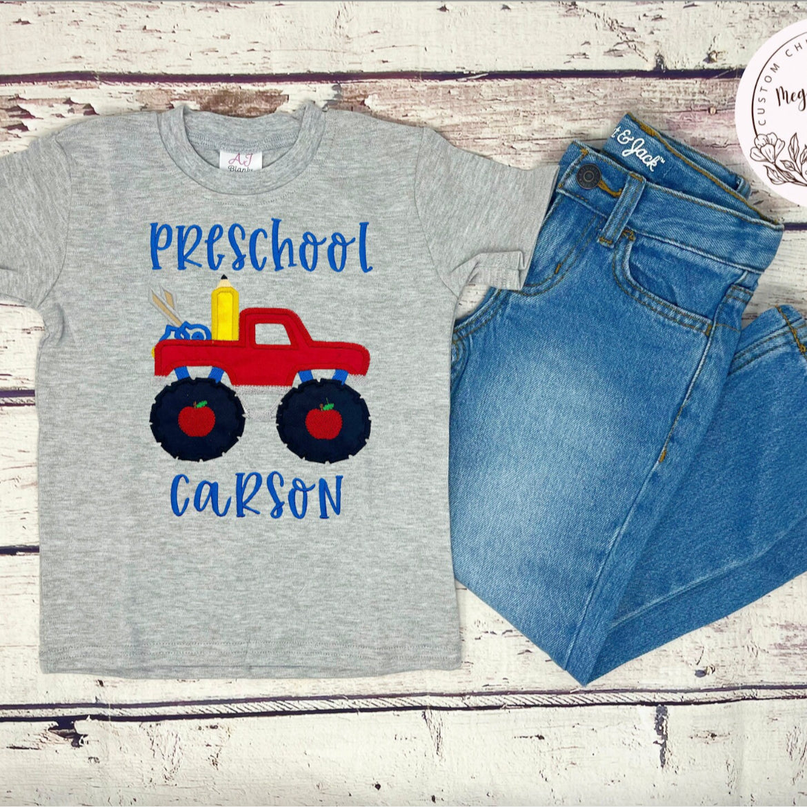 This is a custom embroidered shirt that is perfect for the first day of school! It is customized with your child's name and their grade level. You can choose to get it either in gray or white.