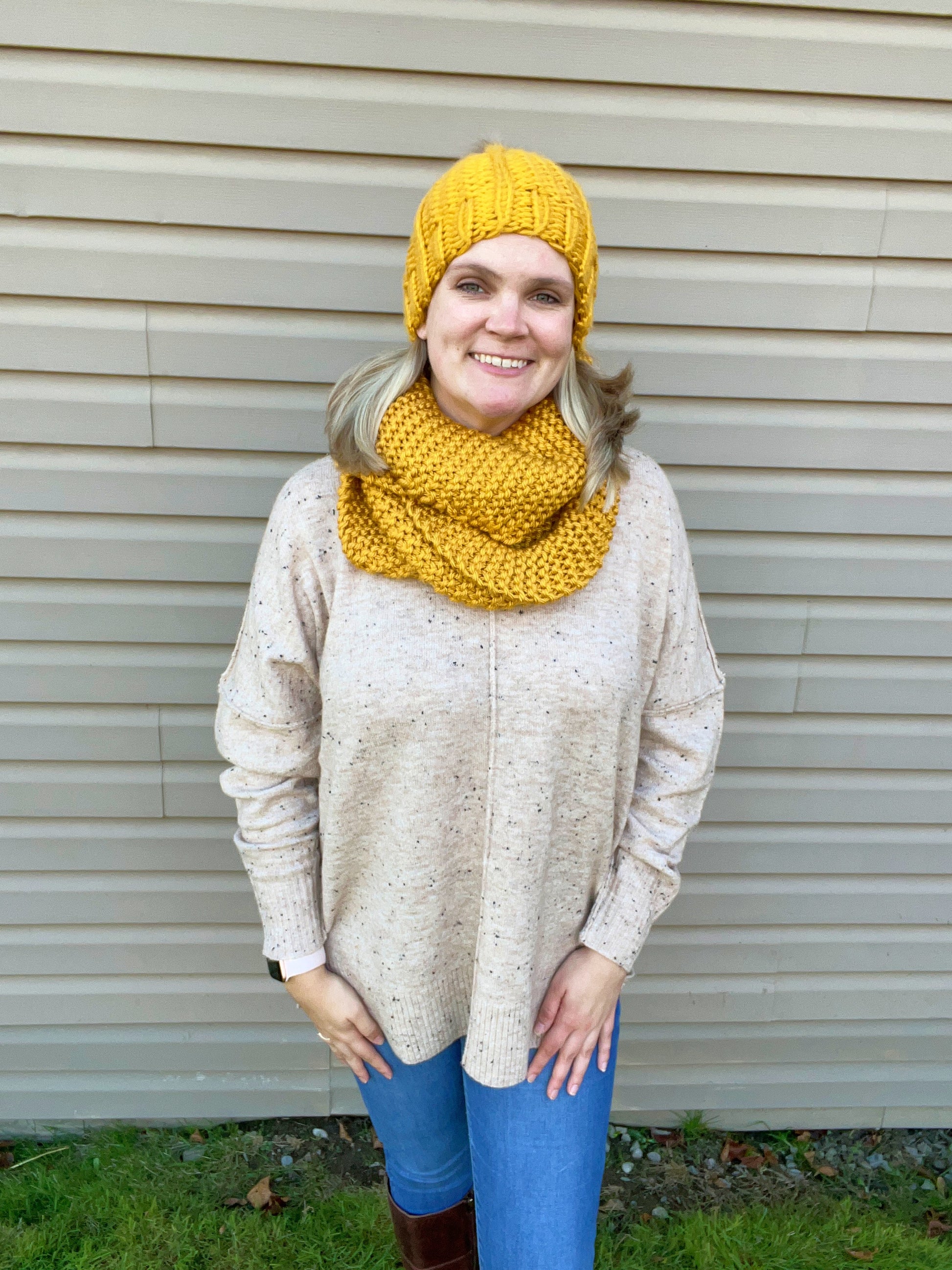 This is a matching red scarf and hat set. Made of chunky knit yarn these accessories are guaranteed to keep you nice and warm in the coming winter months! You can choose if you just want the hat, a scarf, or both the hat and scarf.
