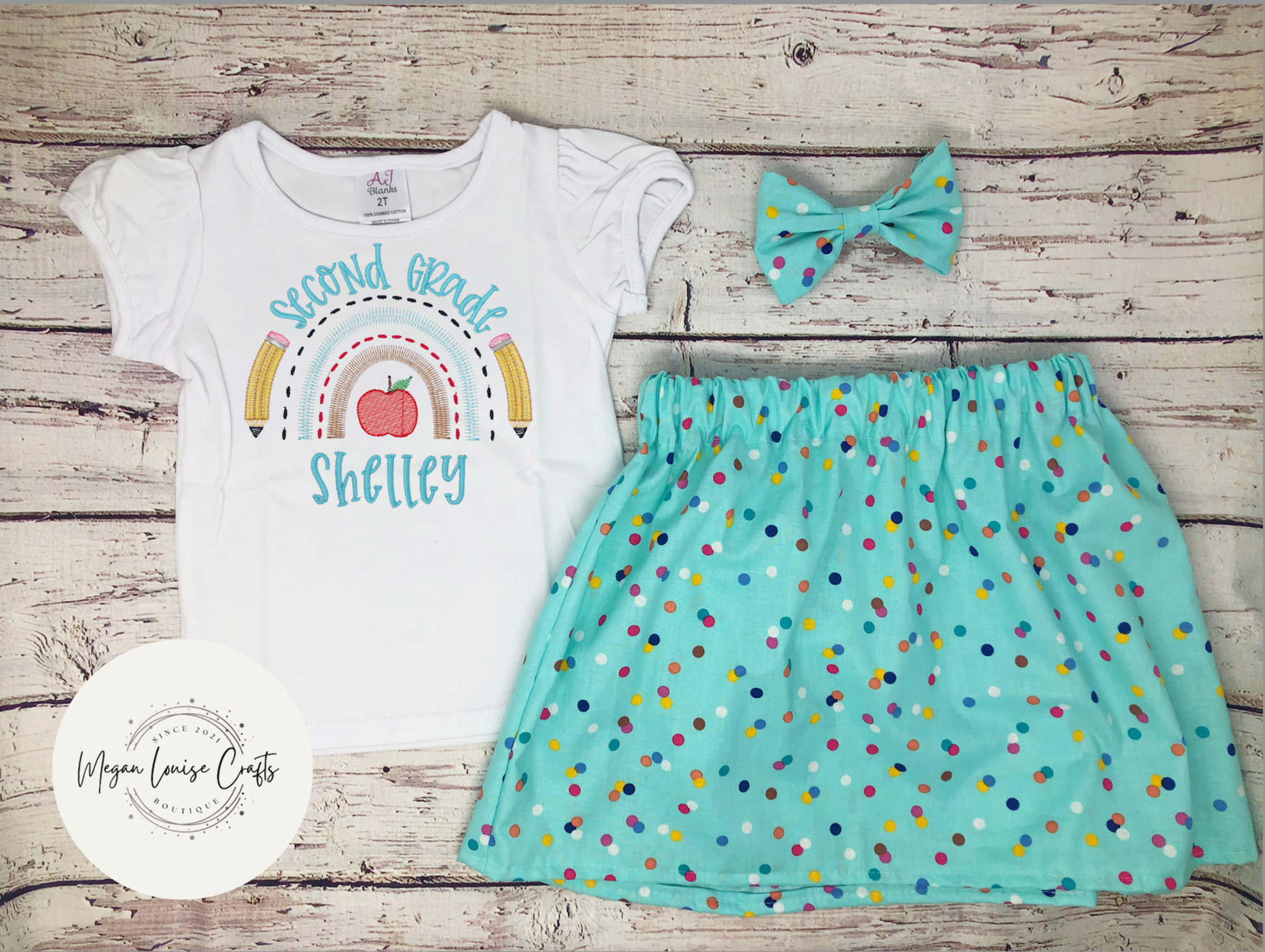 Back to school season is here meaning it's time to get your outfits ready! This is a matching outfit with an embroidered shirt and skirt. The shirt is made of high quality combed cotton and has puffed sleeves. You can choose if you want it to say pre-k all the way to sixth grade. You can decide between shorts, a skirt, and the ruffled skort. Please see image 3 for more details.