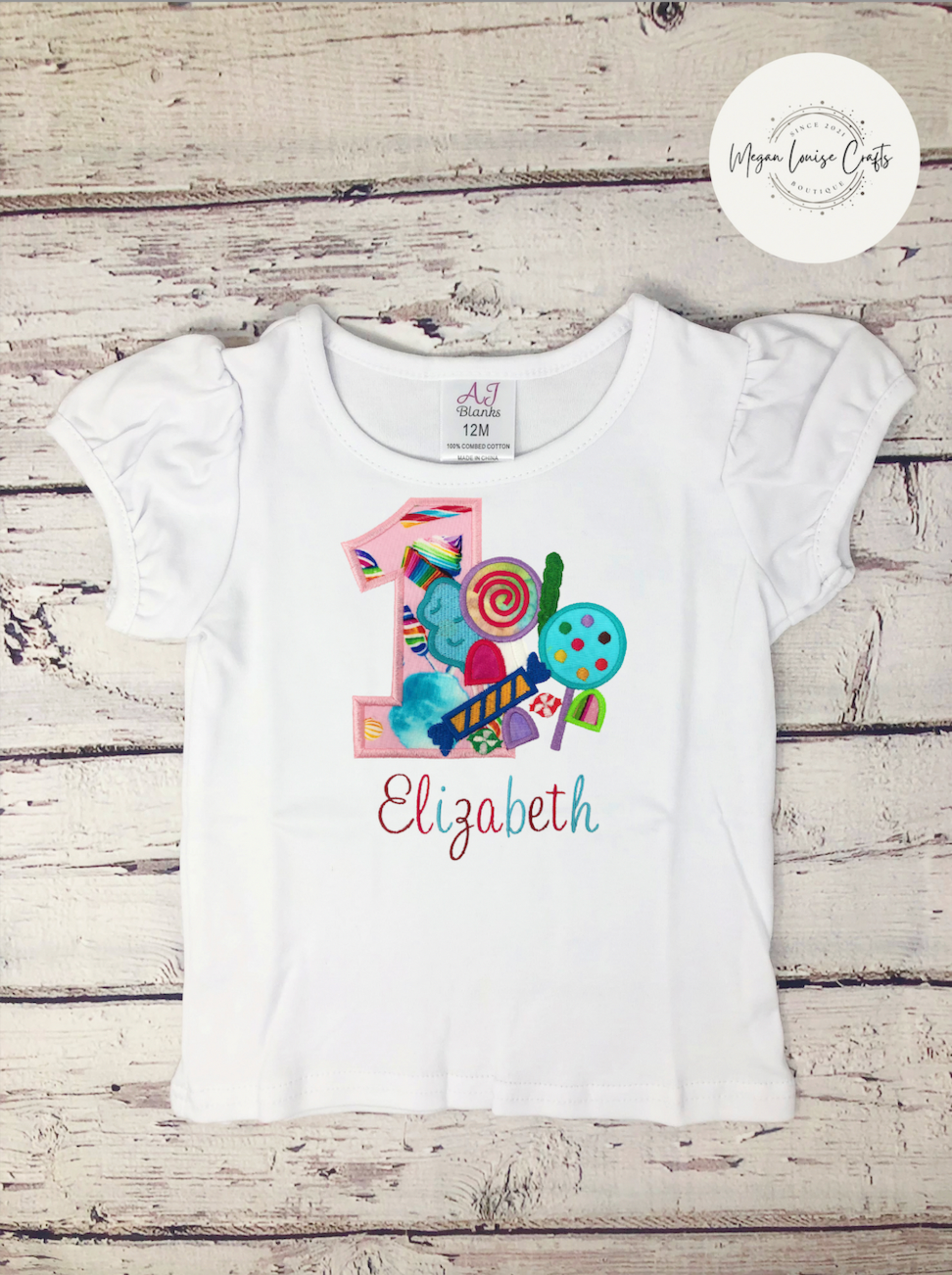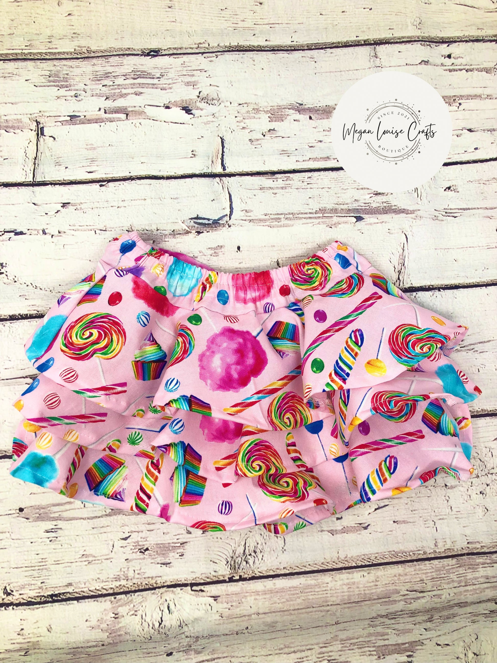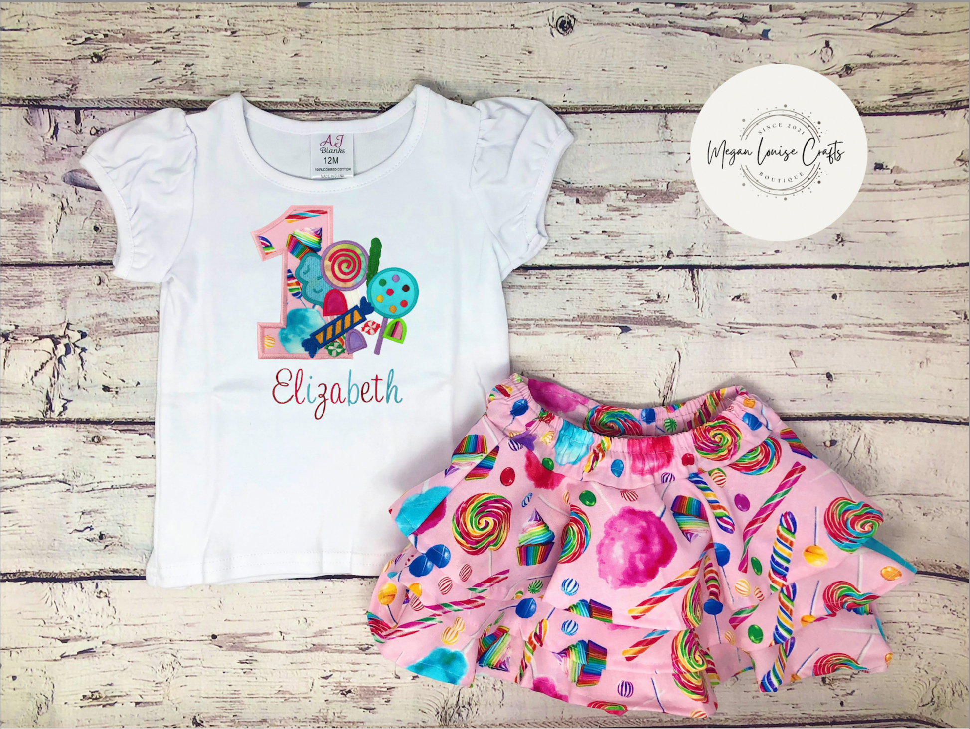 This is a custom candy birthday outfit with a shirt and skirt. The shirt is embroidered and is customized with your child's name. The skirt actually has shorts inside of it, making it a perfect party skirt. The shirt has 3 ruffles, making it nice and flowy. The shirt and skirt are made of 100% cotton.