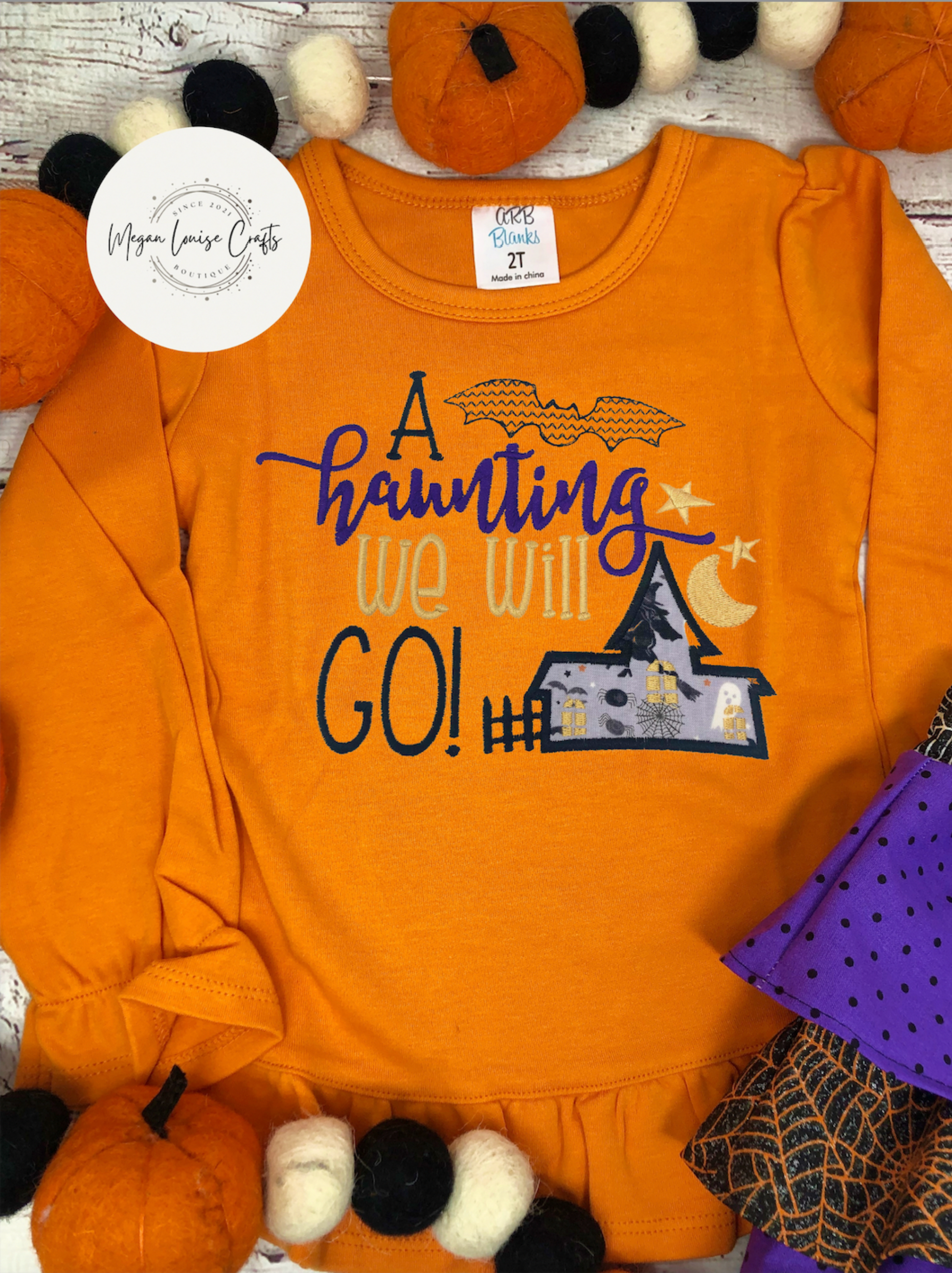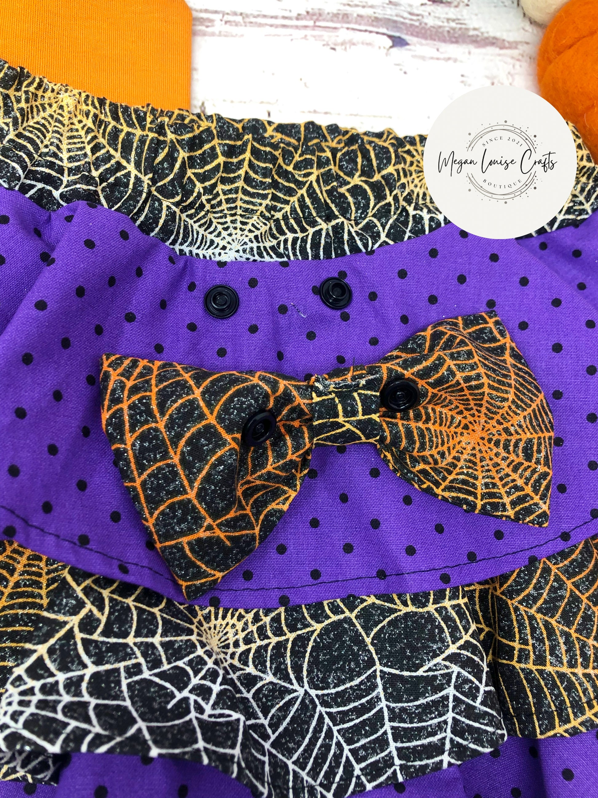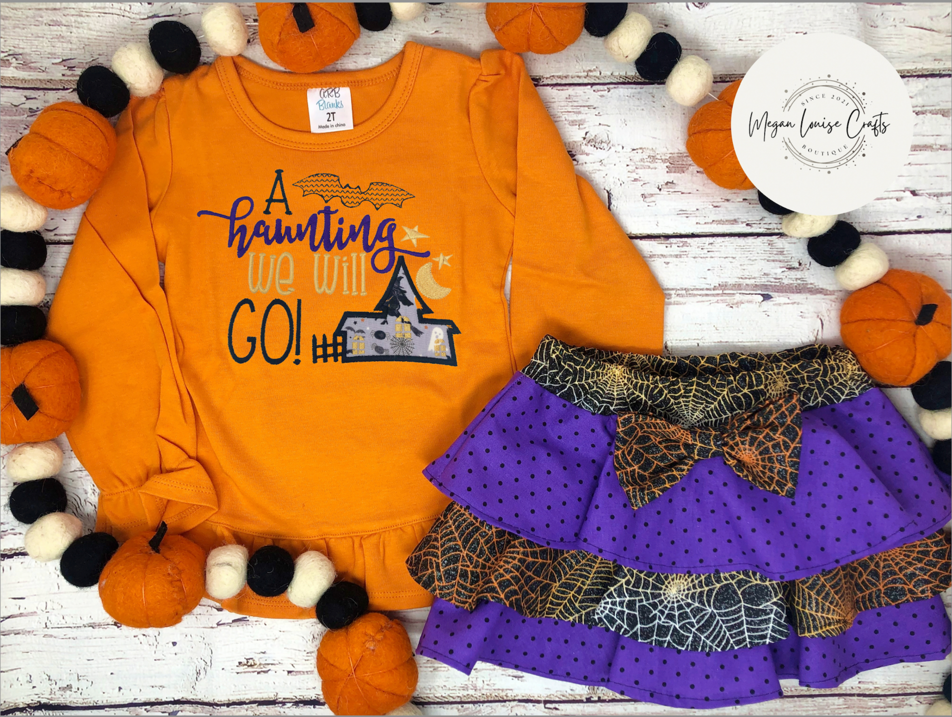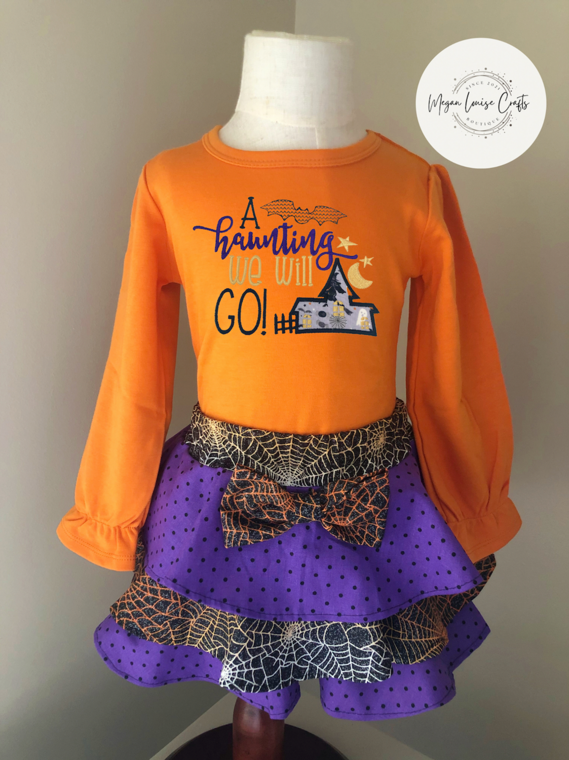 Get your little one ready for Halloween with this trick or treating outfit! This outfit is a perfect party outfit and is practical for your little one to wear. This is a spooky themed outfit and both the top and the bottom are made of 100% cotton. The shirt is embroidered and the appliqué fabric matches the skirt. The shirt is long sleeved and has ruffles on the sleeves and on the bottom of the shirt. The skirt is actually a skort, meaning that it has shorts built into them! The skort has 3 layers of ruffles and there is a bow on the front, which you can easily take on and off with the plastic snaps attached to the front.