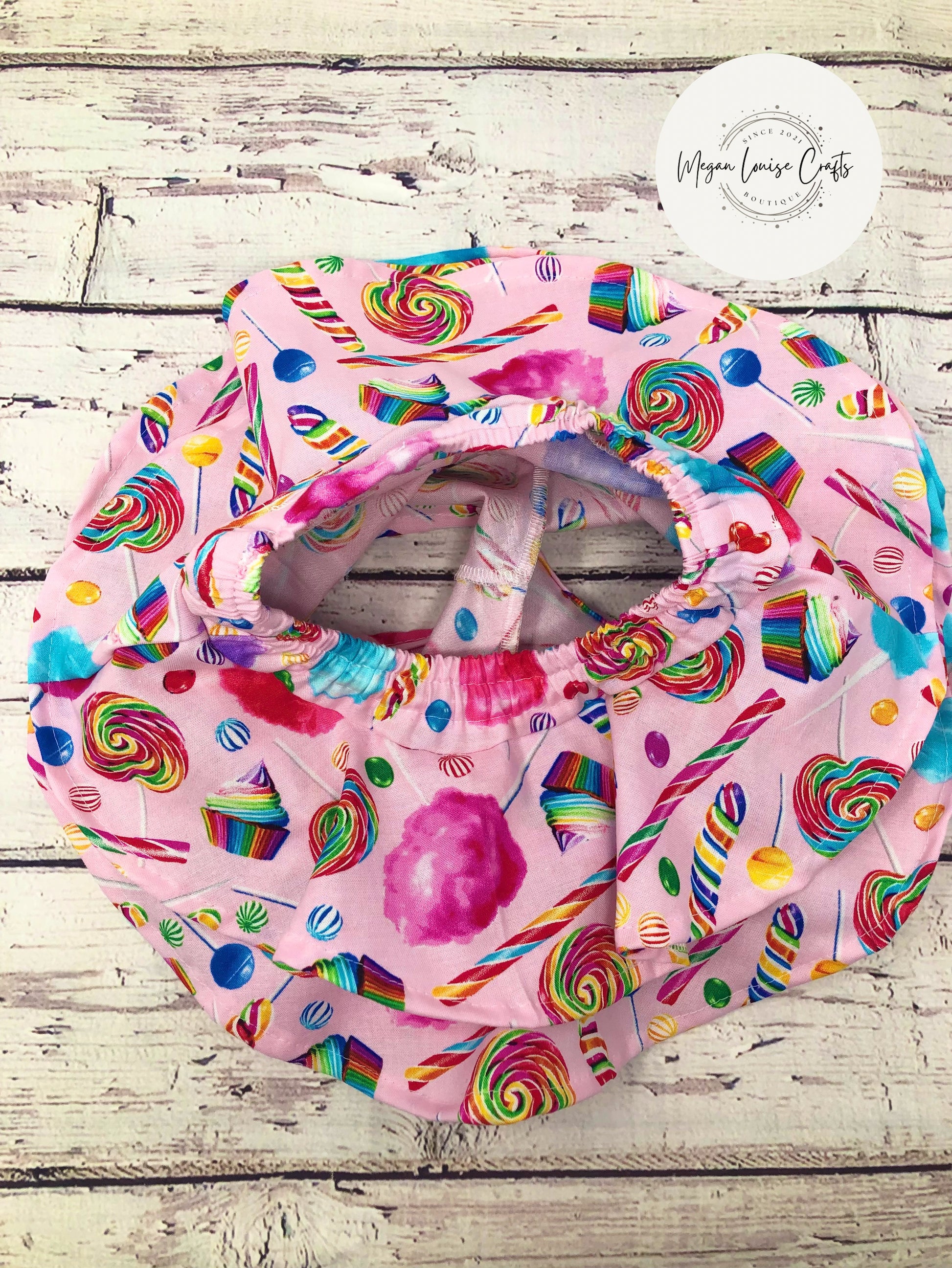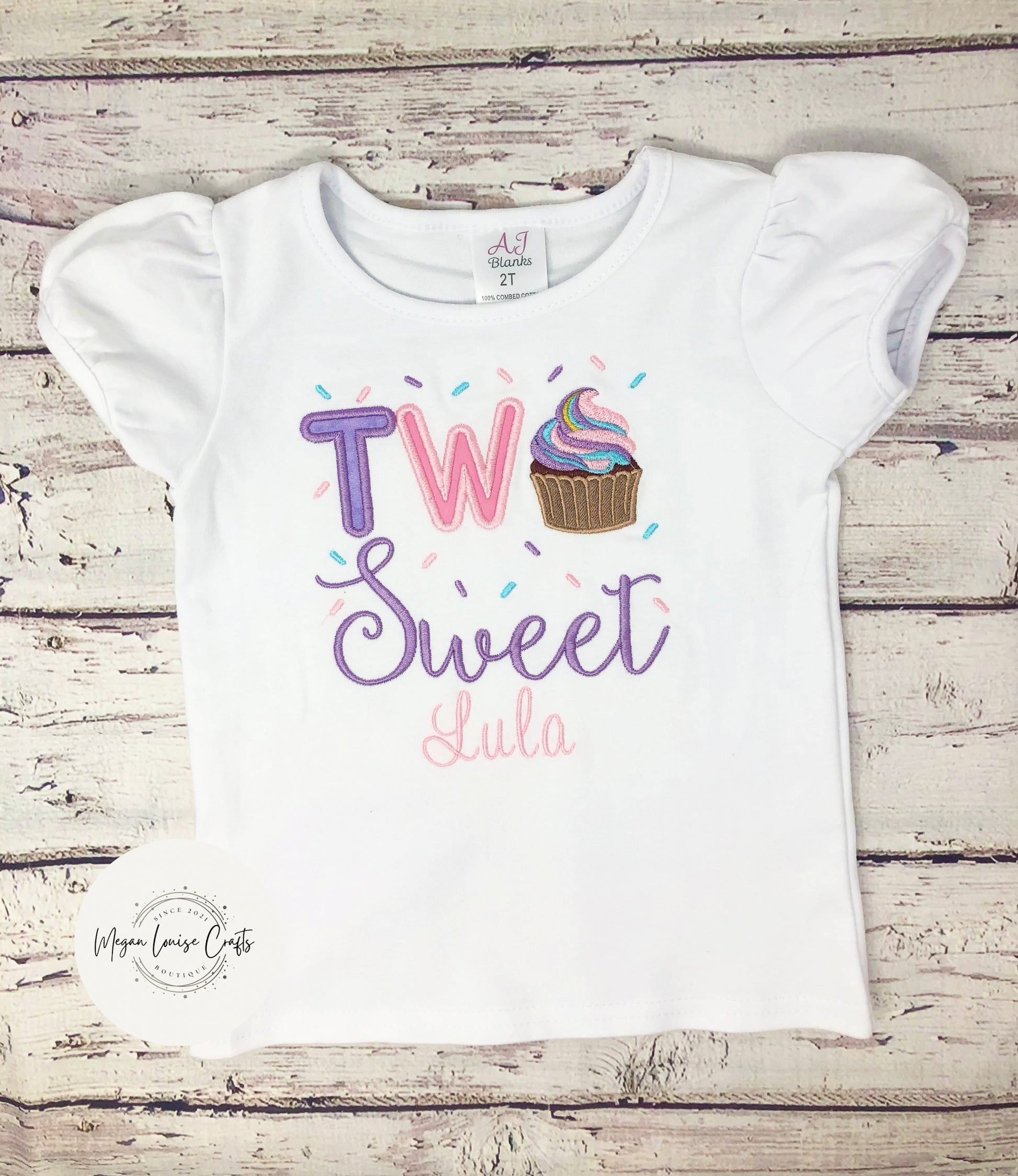 This is a custom candy birthday outfit with a shirt and skirt. The shirt is embroidered and is customized with your child's name. The skirt actually has shorts inside of it, making it a perfect party skirt. The shirt has 3 ruffles, making it nice and flowy. The shirt and skirt are made of 100% cotton.